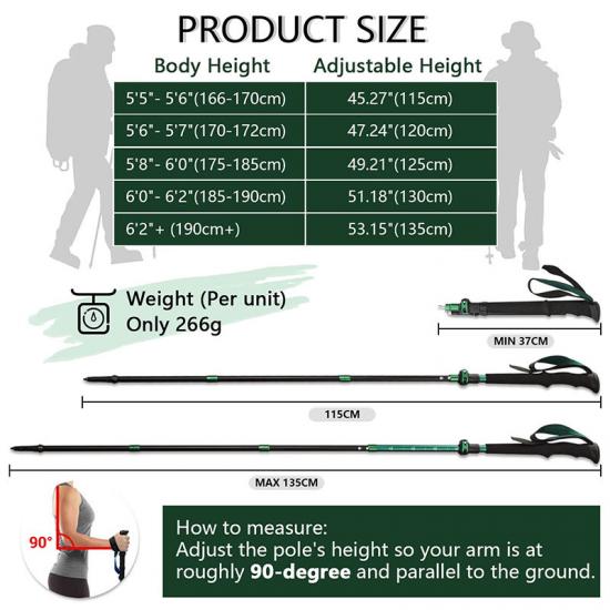 Ved å ta i bruk et kombinasjonslåssystem, kombineres denne turstaven med hurtiglås og vrilås, og en anti-sjokkfjær er bygget i vrilåsområdet, slik at skadevirkningen blir mindre. Du kan bevege deg raskere og raskere mens du bruker energi. justerbar høyde, gangstavene vil passe de fleste. Dessuten, Trekking-staven med klare graderinger og en stopptupp som kan strekke seg fra 25" til 53". Den er så liten og lett som mulig. Passer for alle høyder, fra kort til høye menn, kvinner og til og med barn! Vær forsiktig så du ikke overskrider det.
