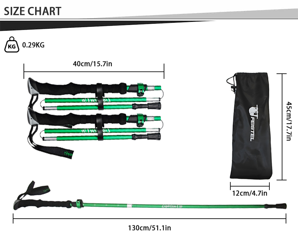 Merke : ANHUI FEISTEL-FABRIKKEN Relatert produksjon : OEM og ODM Produkt : De ultralette multifunksjonelle, sammenleggbare turstavene i aluminium 7075 har slitesterk konstruksjon, komforthåndtak i EVA og er kompakte og bærbare, og tilbyr pålitelig støtte for fotturer, klatring, fotturer og hverdagslige gåturer.