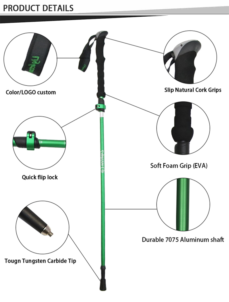 denne turstaven er laget av 7075 aluminiumslegeringsmateriale, som er korrosjonsbestandig og lettere enn andre materialer.