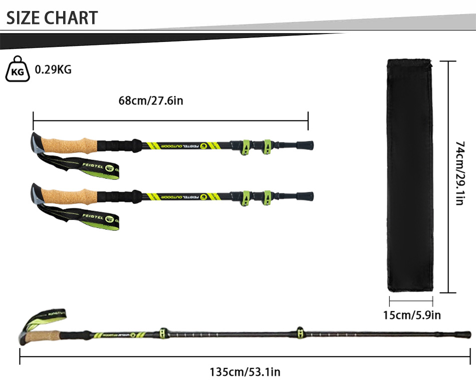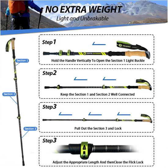 Merke: ANHUI FEISTEL FABRIKK Relatert produksjon: OEM & ODM Produkt: 6013 lettvekts teleskopisk trekkingstang i aluminium: hurtigjusterbare låser, holdbare, allsidige, ergonomiske, lette, ideell for fotturer, tilpassbar lengde, sterk.