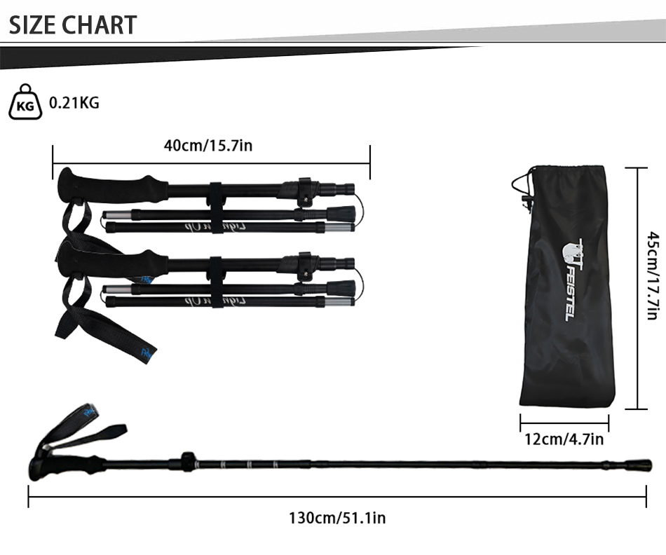 Merke : ANHUI FEISTEL-FABRIKKEN Relatert produksjon : OEM og ODM Produkt : De ultralette multifunksjonelle, sammenleggbare turstavene i aluminium 7075 har slitesterk konstruksjon, komforthåndtak i EVA og er kompakte og bærbare, og tilbyr pålitelig støtte for fotturer, klatring, fotturer og hverdagslige gåturer.