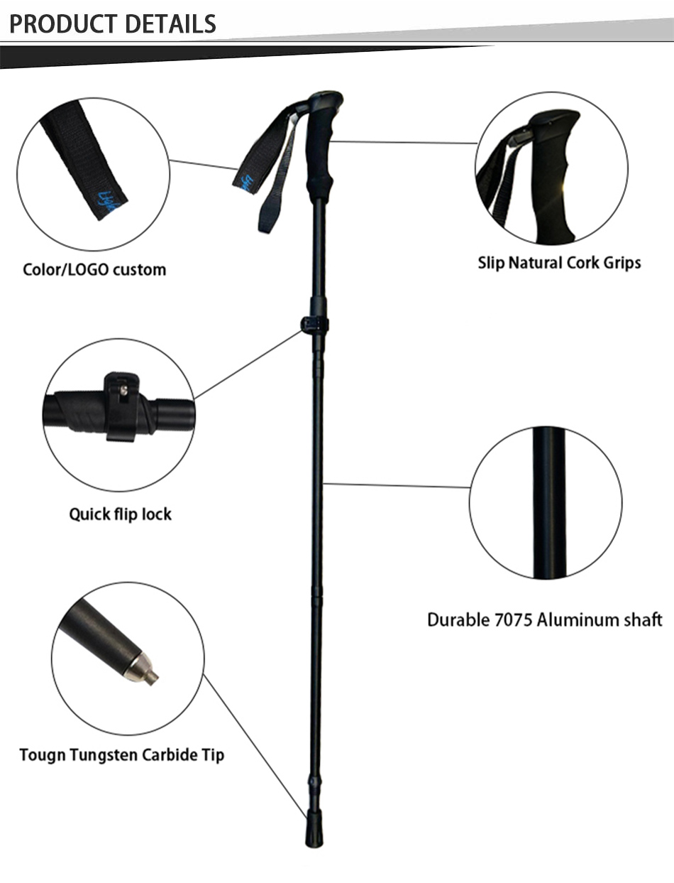 denne turstaven er laget av 7075 aluminiumslegeringsmateriale, som er korrosjonsbestandig og lettere enn andre materialer.