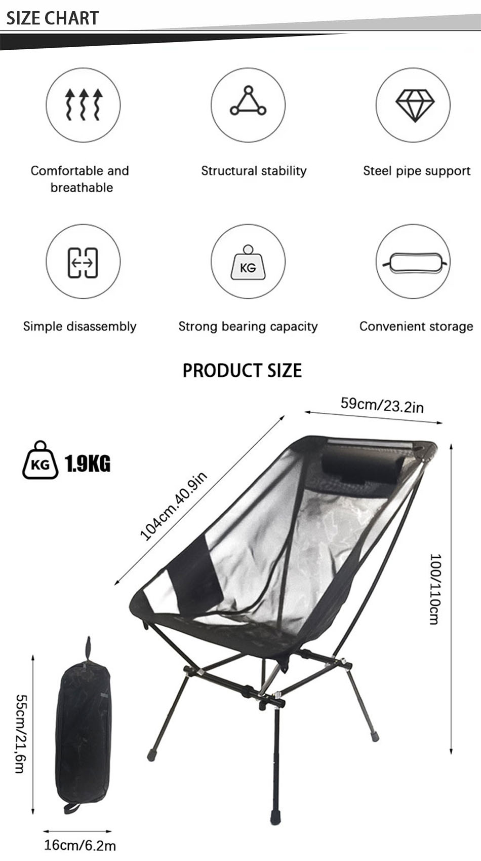 Camping Picnic Black Nylon Mesh lett metall utendørs sammenleggbare strandstoler er designet for komfort, holdbarhet og bærbarhet, noe som gjør dem perfekte for utendørs eventyr.