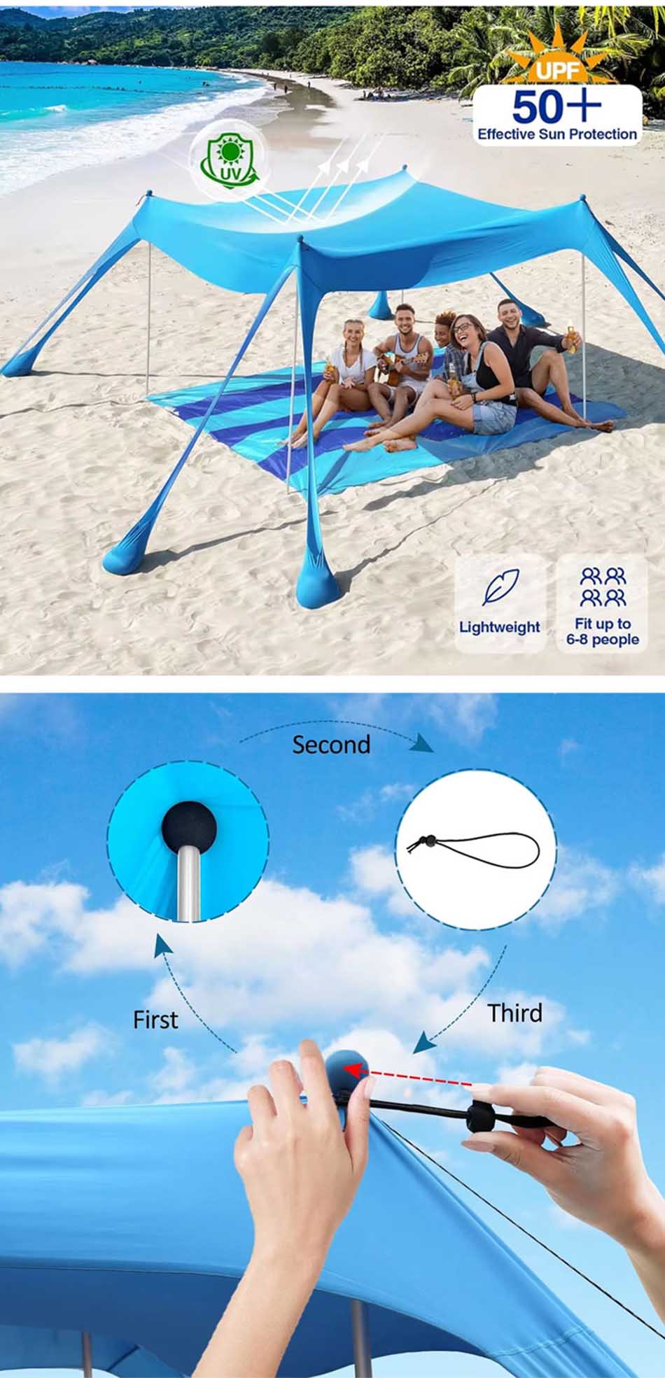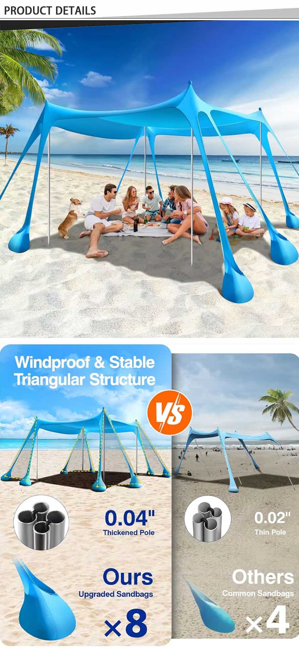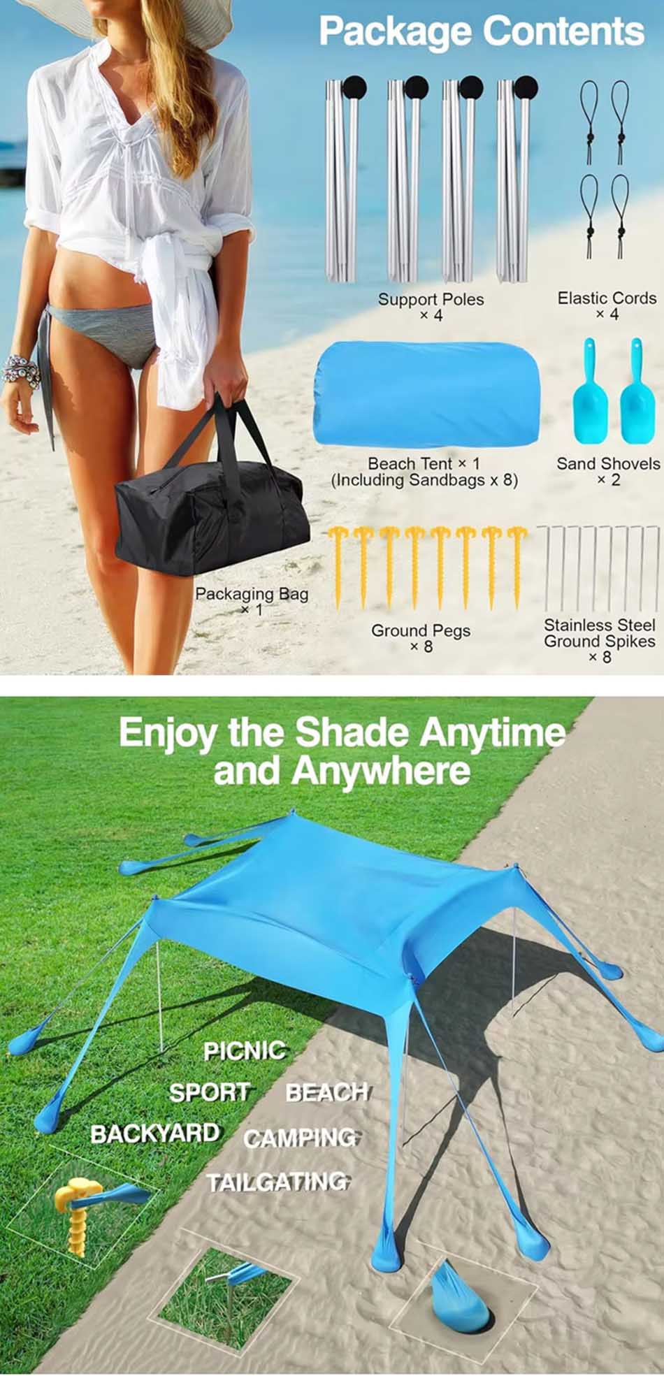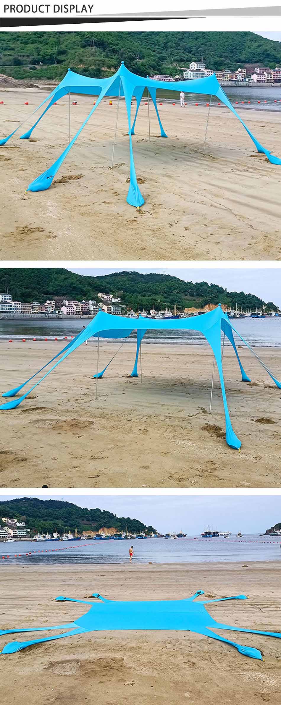 Produkt : Dette solskjermet campingteltet tilbyr pålitelig UV-beskyttelse og pustende dekning, noe som gjør det til et ideelt bærbart strandtelt for utendørs avslapning og solsikkerhet.