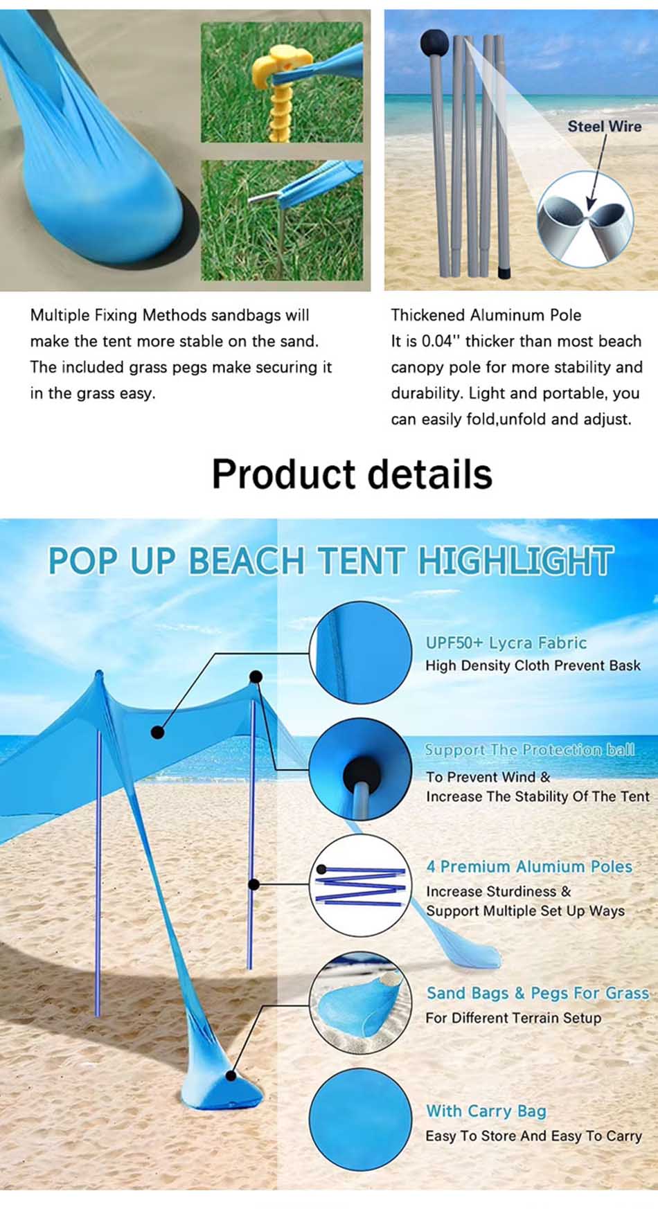 Camping Sun Shade Shelter UV Protection Beach Shade Canopy er et allsidig og viktig tilbehør for utendørseventyr, og gir pålitelig solbeskyttelse og komfort. Laget av UV-bestandig stoff av høy kvalitet, blokkerer dette soltaket skadelige solstråler, noe som sikrer et trygt og skyggefullt område for avslapning. Den lette, sammenleggbare designen gjør den enkel å sette opp, pakke og transportere, noe som gjør den ideell for strandturer, campingturer, piknik og hagesamlinger. De slitesterke støttestengene og sandsekkene sikrer stabilitet, selv i vindfulle forhold. God plass under kalesjen har plass til flere personer eller utstyr, og tilbyr pustende ventilasjon og komfort. Enten du er på stranden eller campingplassen, er dette solskjermingstaket et must for å holde deg kjølig, beskyttet og komfortabel under solfylte utendørsaktiviteter.