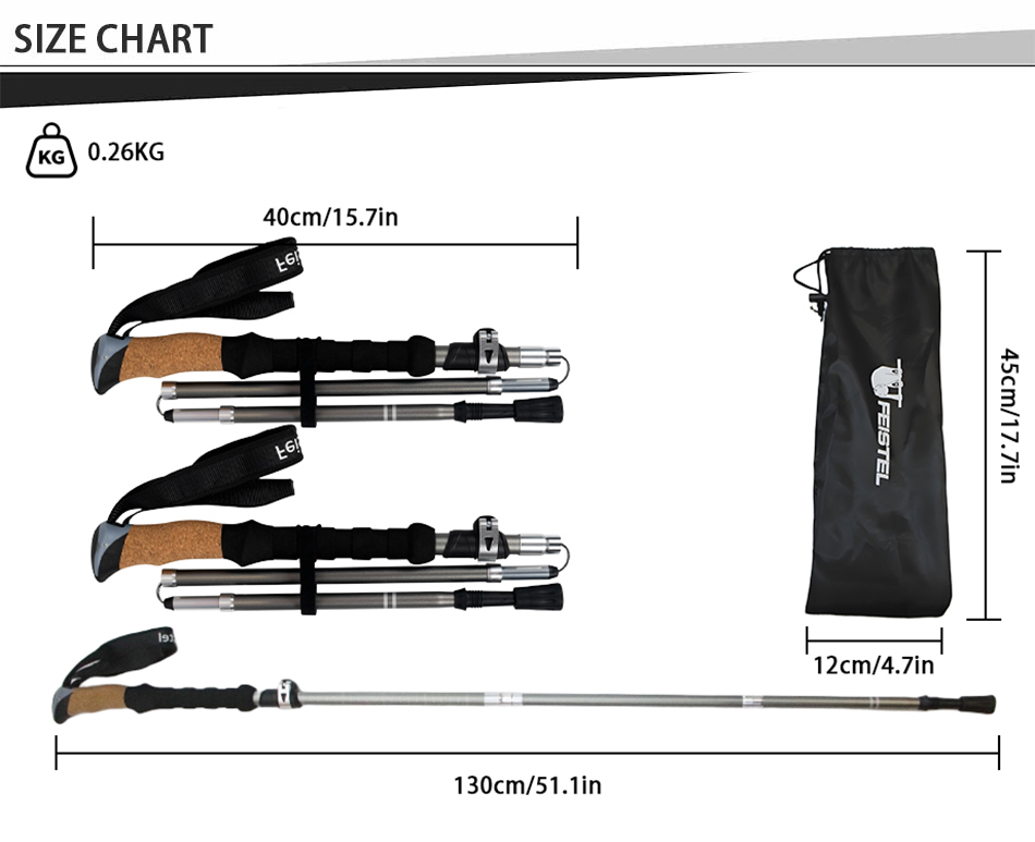 Merke : ANHUI FEISTEL-FABRIKKEN Relatert produksjon : OEM og ODM Produkt : De ultralette multifunksjonelle, sammenleggbare turstavene i aluminium 7075 har slitesterk konstruksjon, komforthåndtak i EVA og er kompakte og bærbare, og tilbyr pålitelig støtte for fotturer, klatring, fotturer og hverdagslige gåturer.