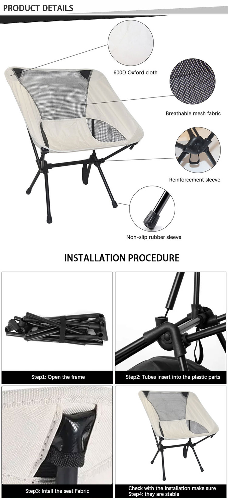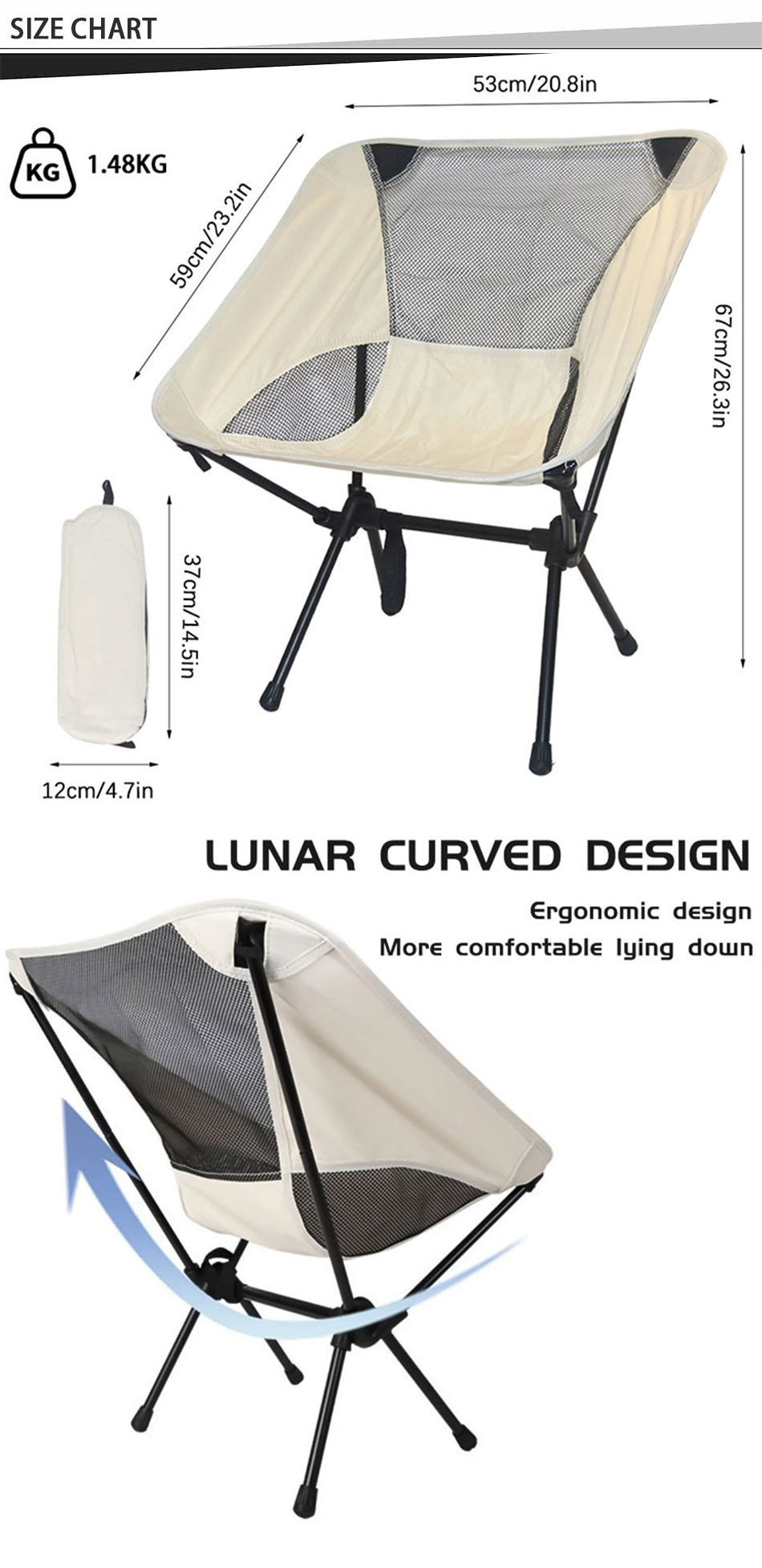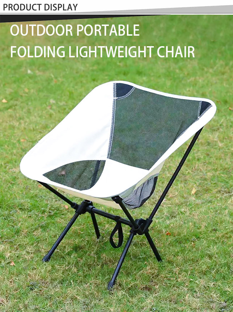 Produkt : Den spesialtilpassede, lette, sammenleggbare månestolen i metall og jern tilbyr slitesterk støtte og komfort, ideell for utendørs camping, med et kompakt, bærbart design for enkel transport og oppbevaring.