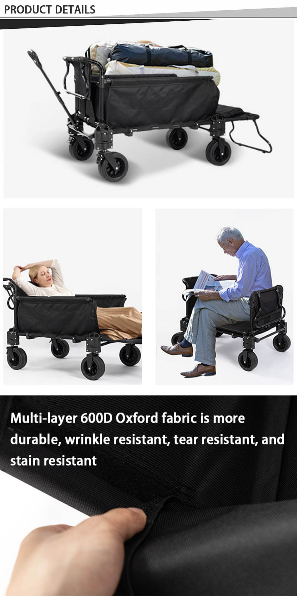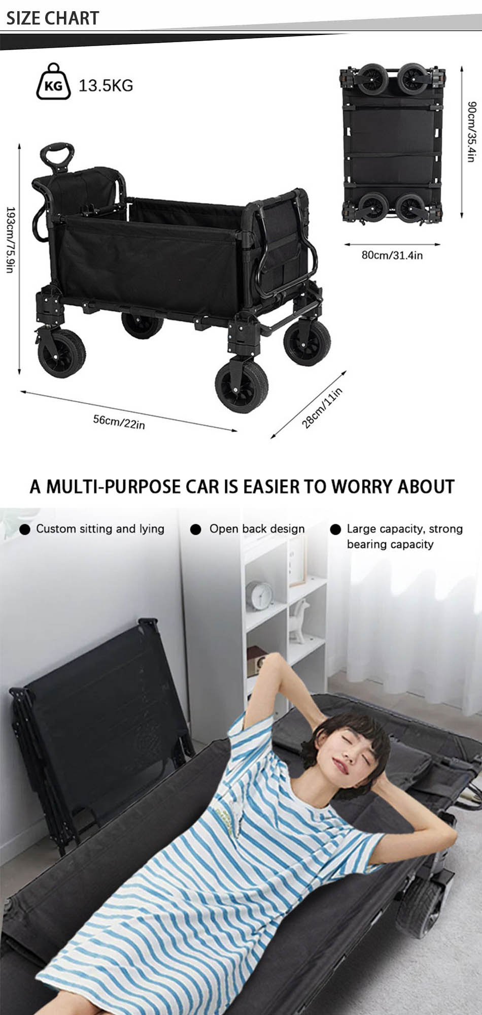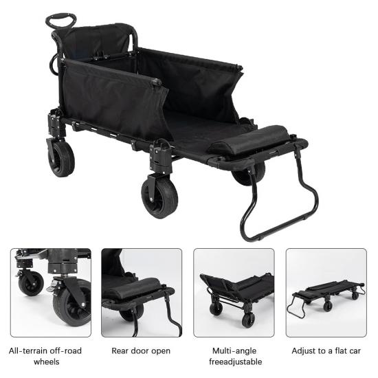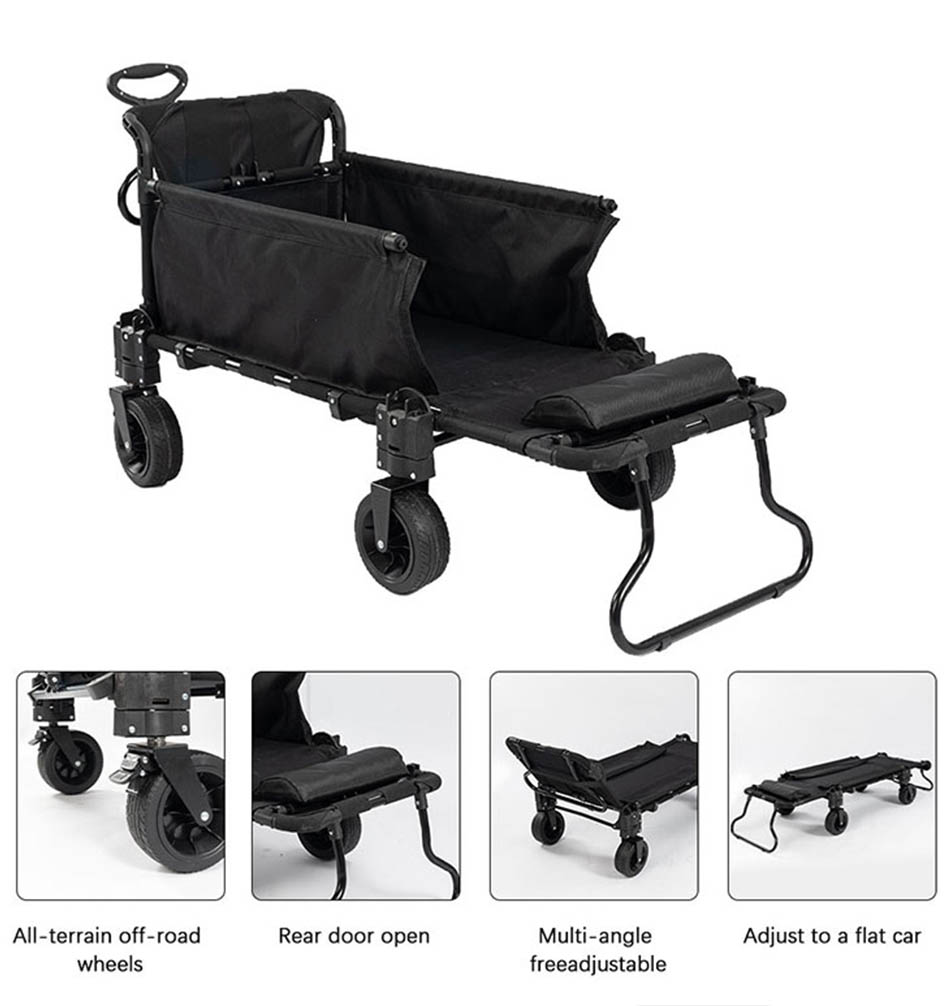 Den er designet for maksimal bekvemmelighet, og fungerer som en shoppingvogn, sammenleggbar verktøyvogn og til og med en sofa -seng, noe som gjør den ideell for forskjellige behov.   Den solide rammen sikrer holdbarhet og stabilitet, mens den sammenleggbare designen gir enkel lagring og transport.