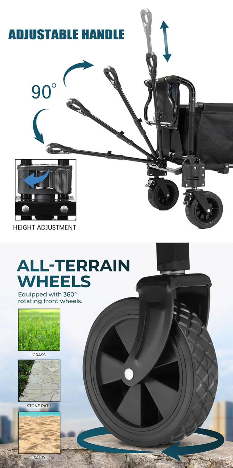 Når du arbeider i hagen, gir det sammenleggbare utendørs hageverktøyet enkel tilgang til hageredskaper. Den er også ideell for familieutflukter, distribusjon av forsyninger og tiltrekning av kjæledyr med begrenset bevegelse. Uttrekkbart robust stålrør med høykvalitets plasthåndtak for komfortabelt grep og enkel håndtering.
