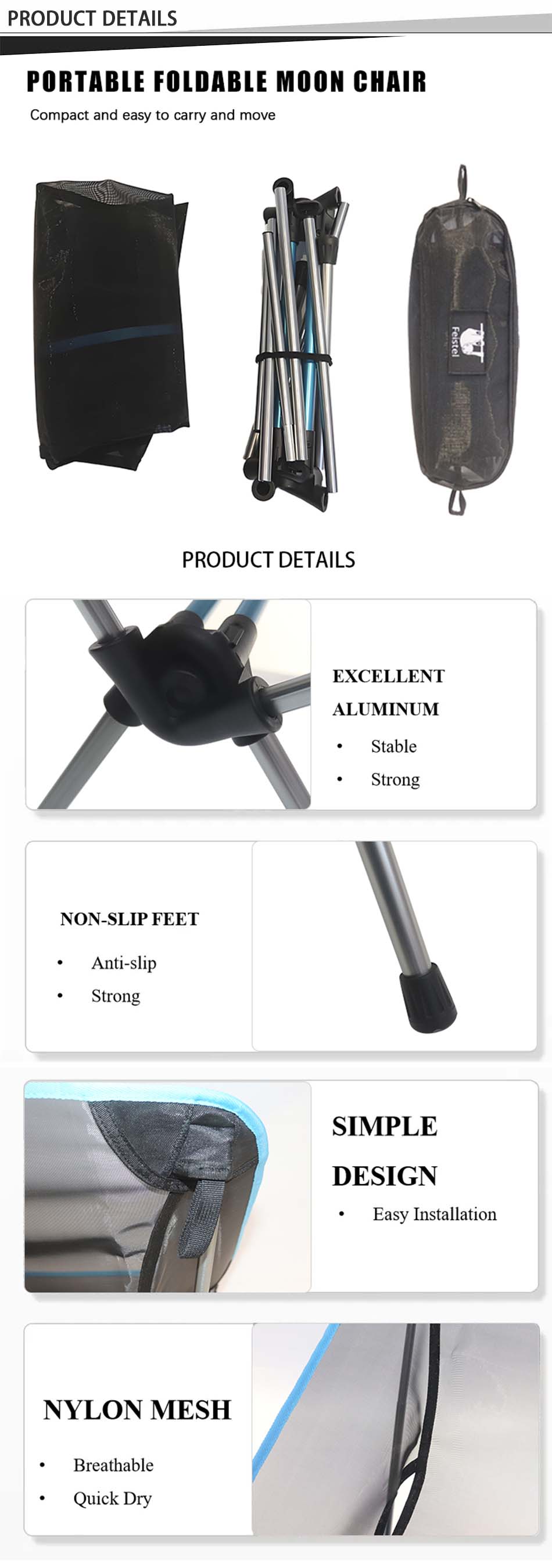 Merke : Anhui Feistel Factory relatere produksjon : OEM & ODM Produkt : Ultra Lightweight Folding Stol