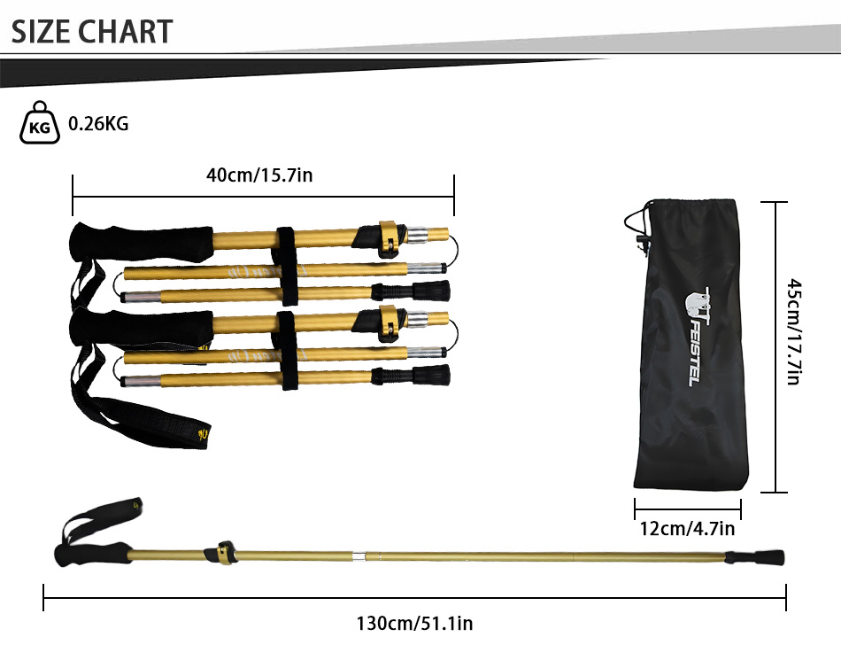 Merke : ANHUI FEISTEL-FABRIKKEN Relatert produksjon : OEM og ODM Produkt : De ultralette multifunksjonelle, sammenleggbare turstavene i aluminium 7075 har slitesterk konstruksjon, komforthåndtak i EVA og er kompakte og bærbare, og tilbyr pålitelig støtte for fotturer, klatring, fotturer og hverdagslige gåturer.