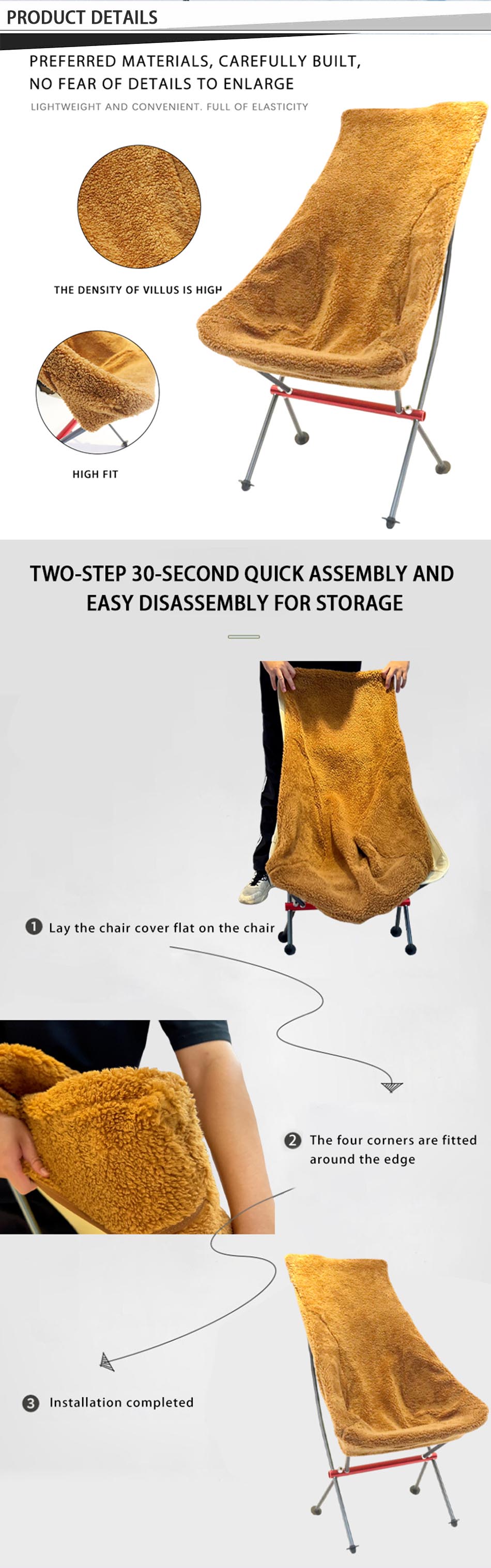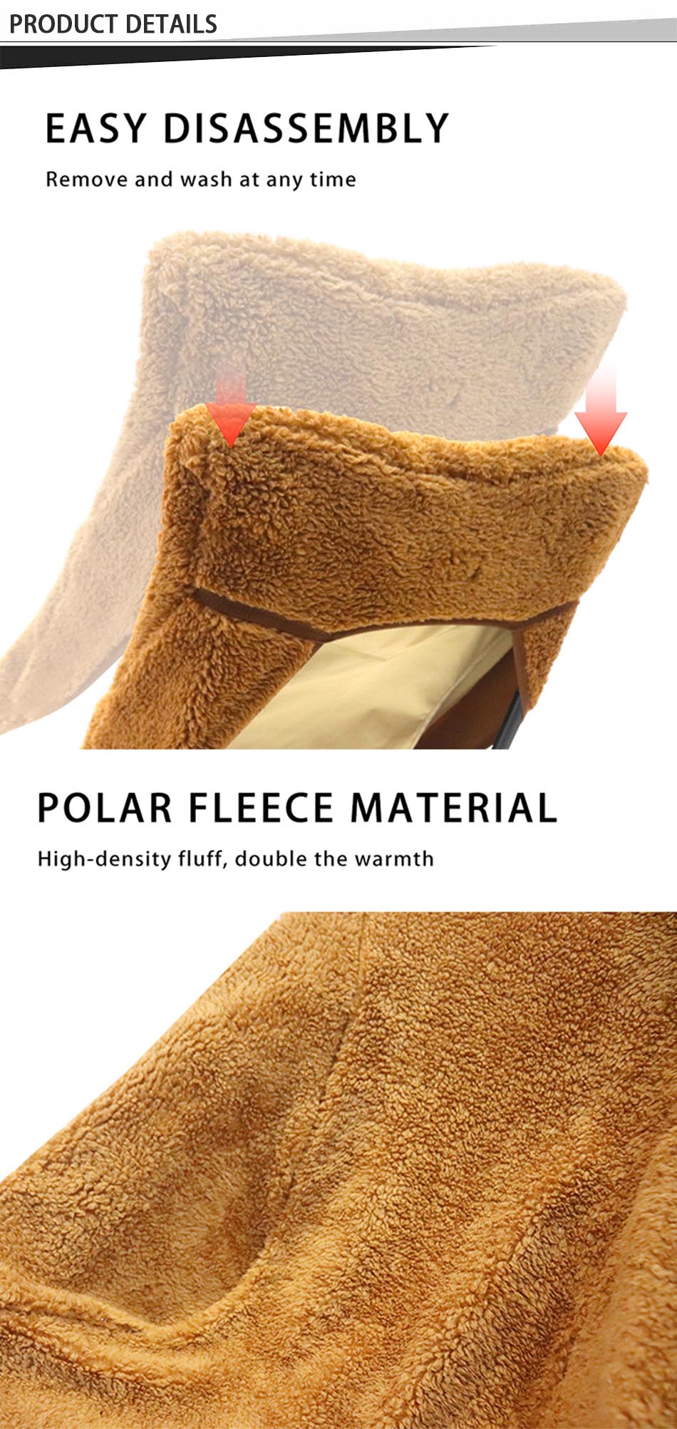 Produkt : Det avtakbare trekket i fleece for campingstolvarmere gir koselig varme og komfort, og passer enkelt over campingstoler som et avtakbart trekk, ideelt for avslapning utendørs i kjøligere vær.
