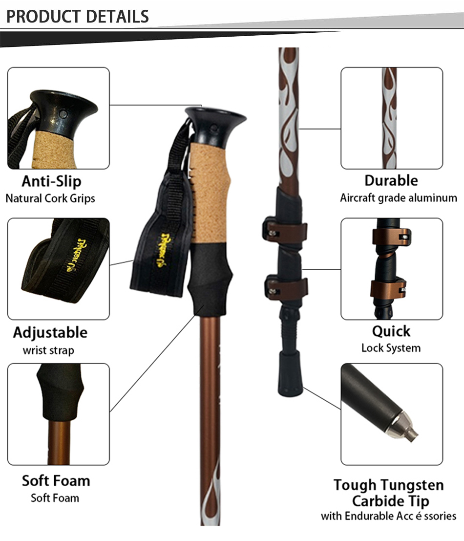 Merke: ANHUI FEISTEL FABRIKK Relatert produksjon: OEM & ODM Produkt: 6013 lettvekts teleskopisk trekkingstang i aluminium: hurtigjusterbare låser, holdbare, allsidige, ergonomiske, lette, ideell for fotturer, tilpassbar lengde, sterk.