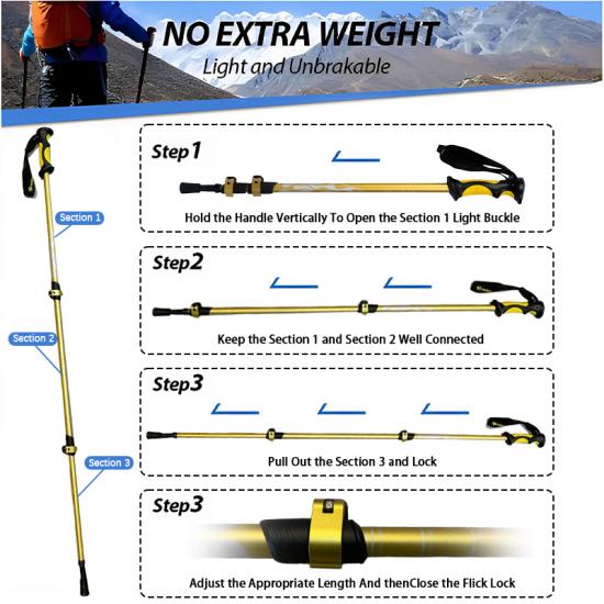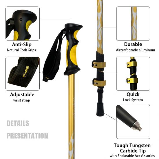 Produkt : Teleskopiske vandrestaver i aluminium på 105–135 cm har justerbar høyde, støtdempende design, lettvekt og pålitelig stabilitet, og gir komfortabel støtte for fotturer, fjellturer og utendørs gåturer.