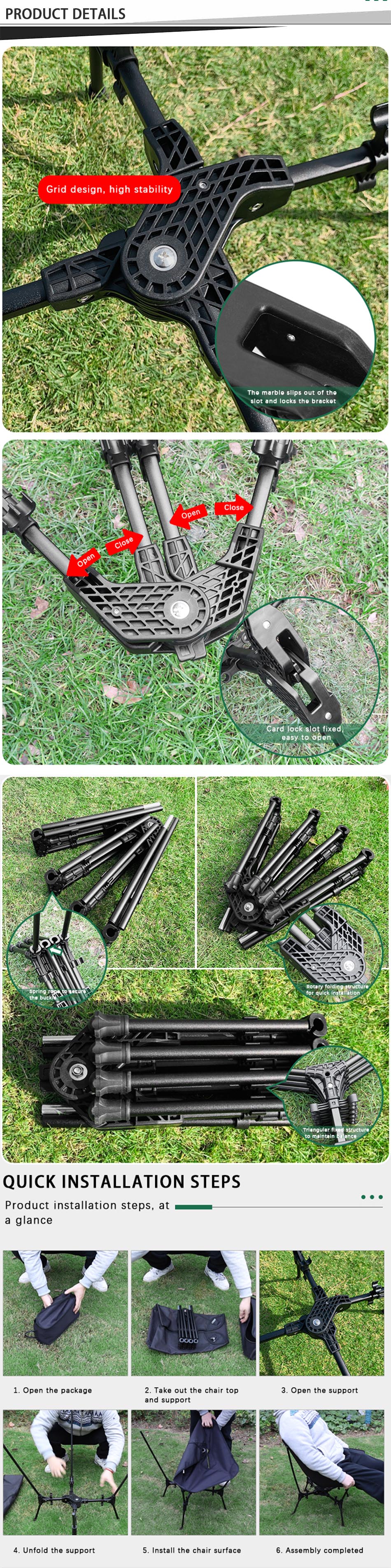 Merke : ANHUI FEISTEL FACTORY Relatert produksjon : OEM & ODM Produkt : Sammenleggbar aluminium utendørs strandcamping bærbar stol, komfortabel og bærbar, du kan nyte fritid og komfort mens du camper.
