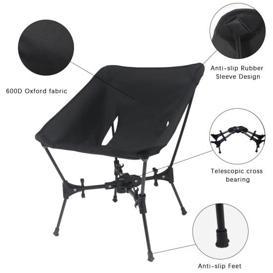 Enten du sitter ved leirbålet eller nyter en solnedgang, gir stolens sklisikre føtter stabilitet i forskjellige terreng, mens den elegante designen gir et moderne preg på utstyret ditt. Opplev uovertruffen bekvemmelighet og komfort med denne bærbare campingstolen  Et must for enhver friluftsentusiast!