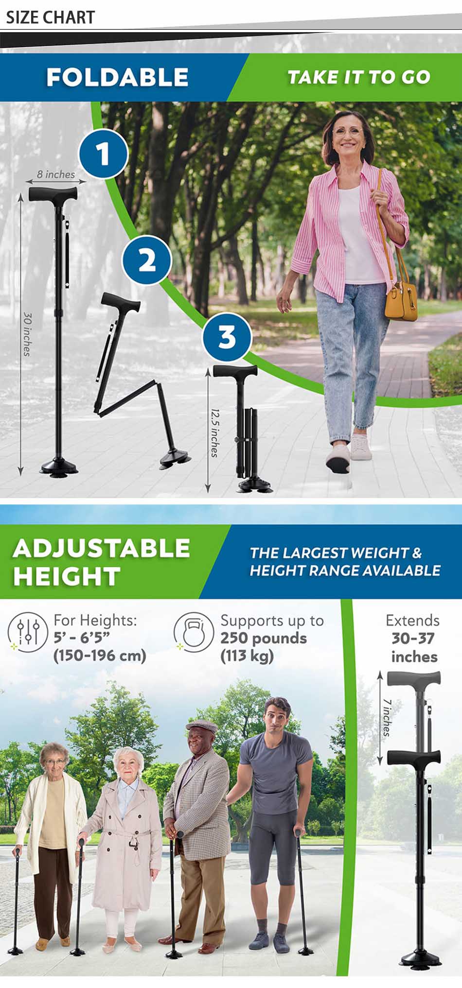 Produkt : Den nye spaserstokken for gamle mennesker har et sammenleggbart design med et komfortabelt T-håndtak, stabil sklisikker base og slitesterk konstruksjon, noe som gir eldre brukere forbedret balanse, sikkerhet og støtte ved gang utendørs.