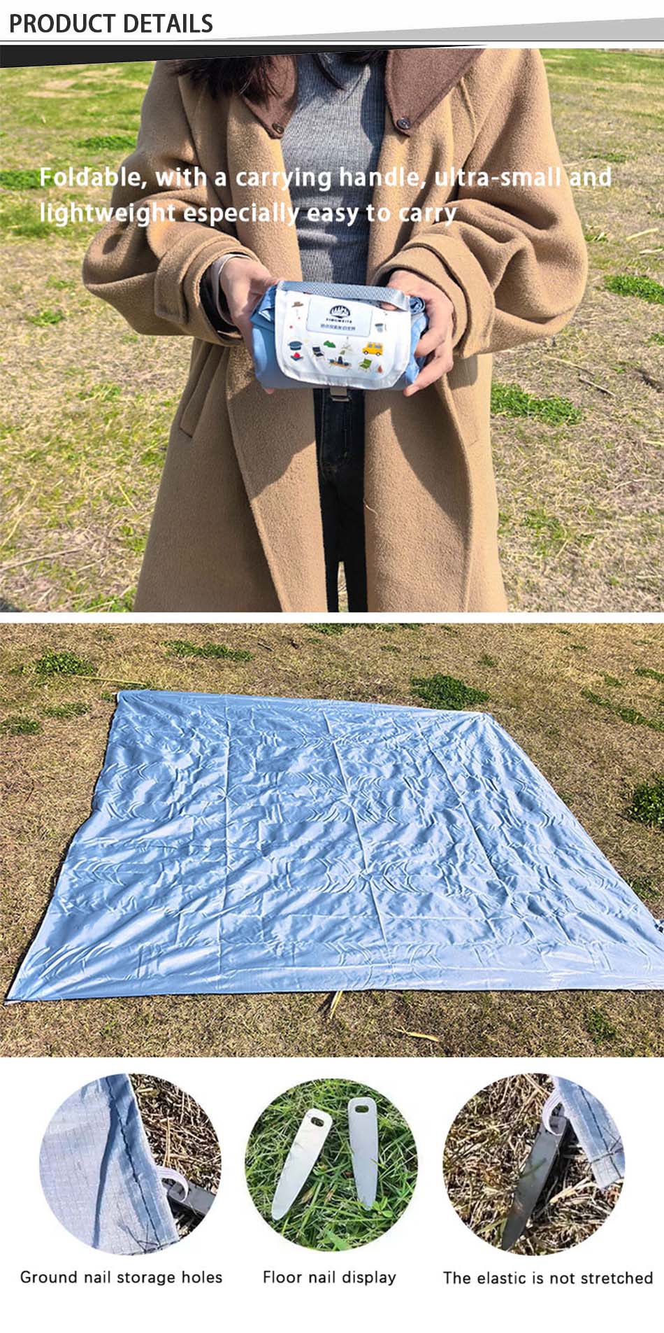 Merke : ANHUI FEISTEL FACTORY Relatert produksjon : OEM & ODM Produkt : Bærbart, vanntett, sammenleggbart piknikteppe for utendørseventyr. Perfekt for strand, camping, fotturer, reise; lett, sandtett og slitesterk.