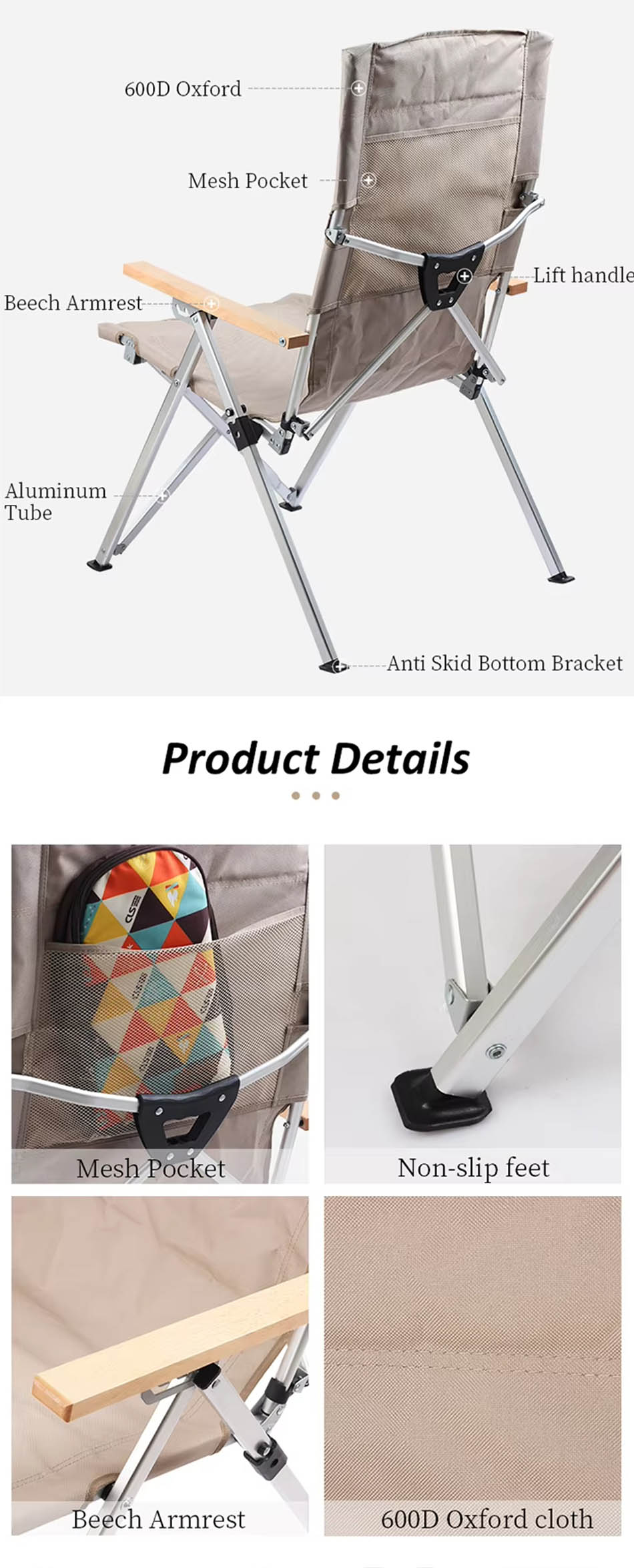 Produkt : Denne sammenleggbare campingstolen med aluminiumsramme for utendørs bruk har justerbar ryggstøtte, et lett, men solid design, og tilbyr bærbar komfort for camping, strandturer, piknik og avslapning utendørs.