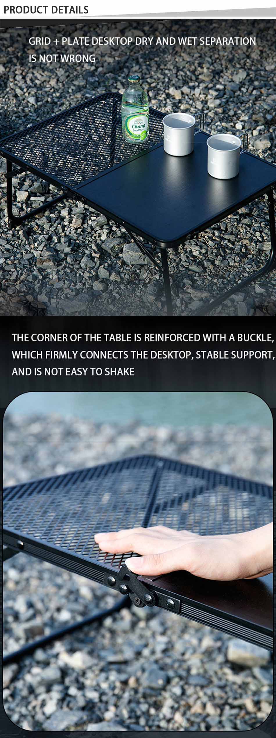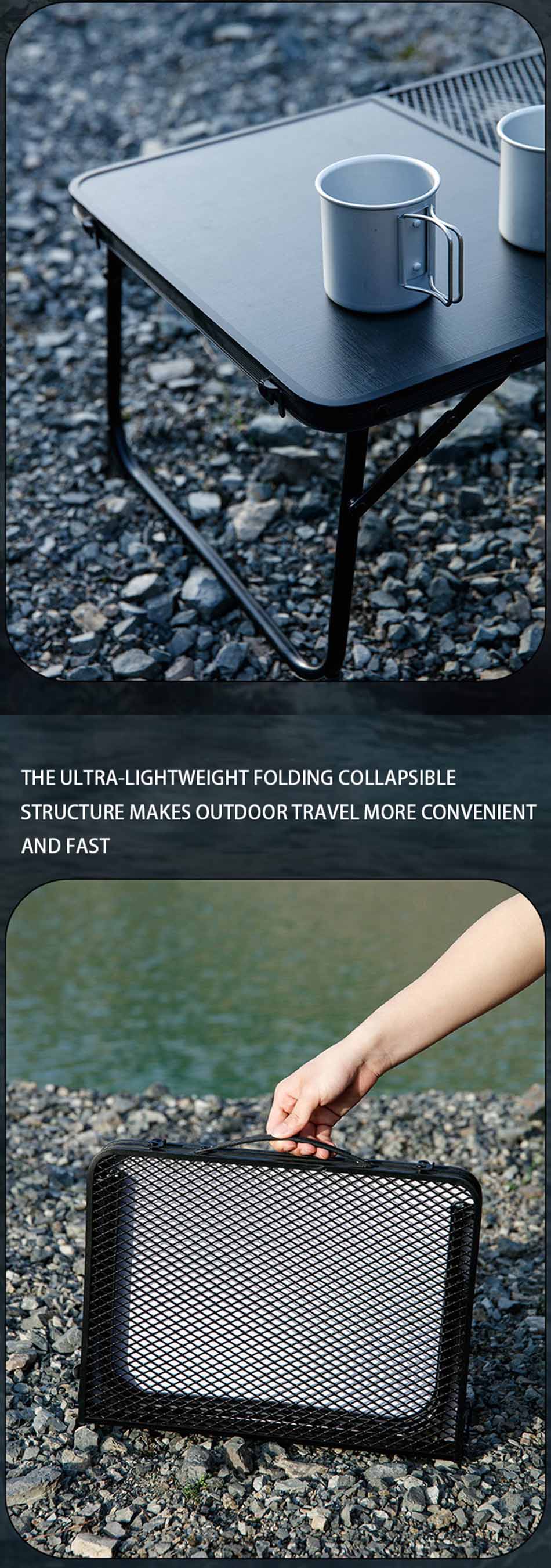 Produkt : Ultralett, bærbart campingbord i netting for hagemøbler har en slitesterk aluminiumsramme, kompakt IGT-sammenleggbar design og pustende nettingoverflate, ideell for allsidig utendørs bruk.