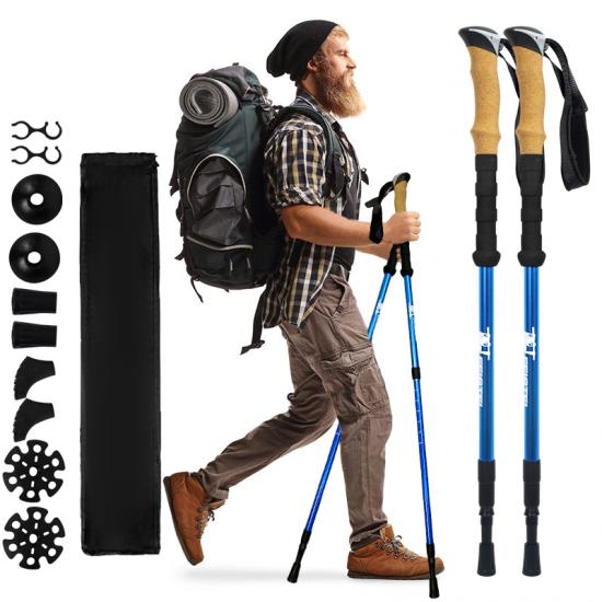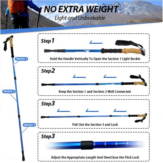 Produkt : Utendørs teleskopisk turstang i duraluminium 6061 aluminiumslegering med tre seksjoner gir lett og styrke, justerbar støtte og pålitelig stabilitet for fotturer, fjellturer og hverdagslige gåturer utendørs.
