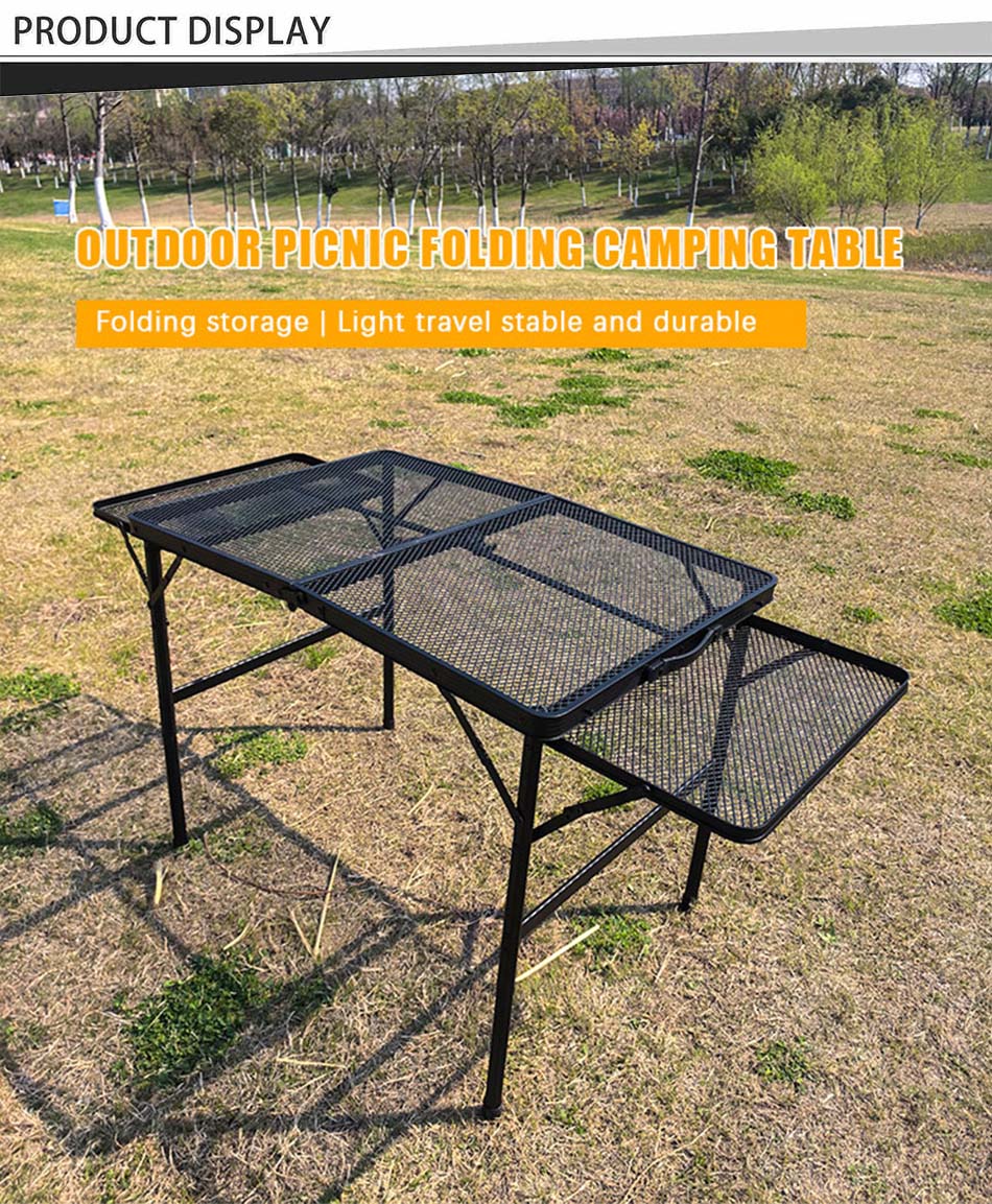 Produkt : Dette piknik utendørs hylla sammenleggbare metallgrillbord har to sideshyller, og tilbyr stabilitet, holdbarhet og bekvemmelighet for familiecamping, utendørs matlaging og grillsamlinger.