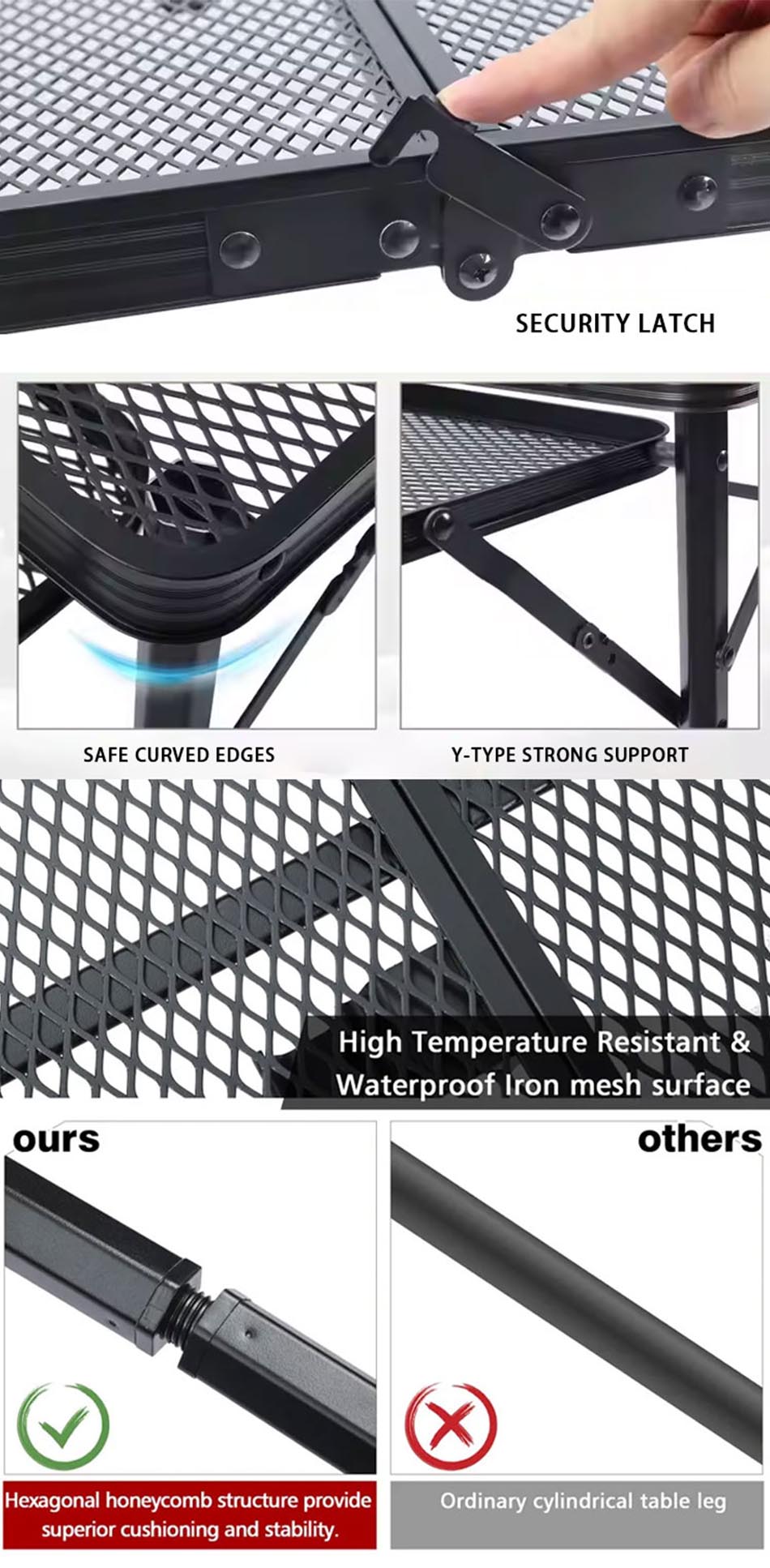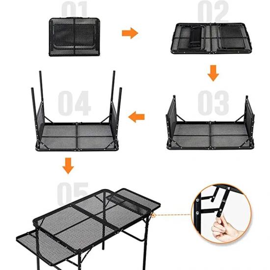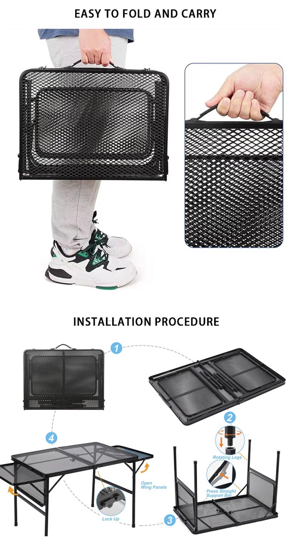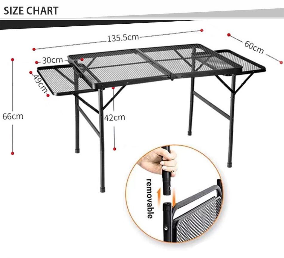 Konstruert av metall av høy kvalitet, gir det utmerket stabilitet og vektkapasitet, og sikrer en pålitelig overflate for grilling og måltidspreparat. Den sammenleggbare designen gir enkel oppsett, kompakt lagring og praktisk bærbarhet.