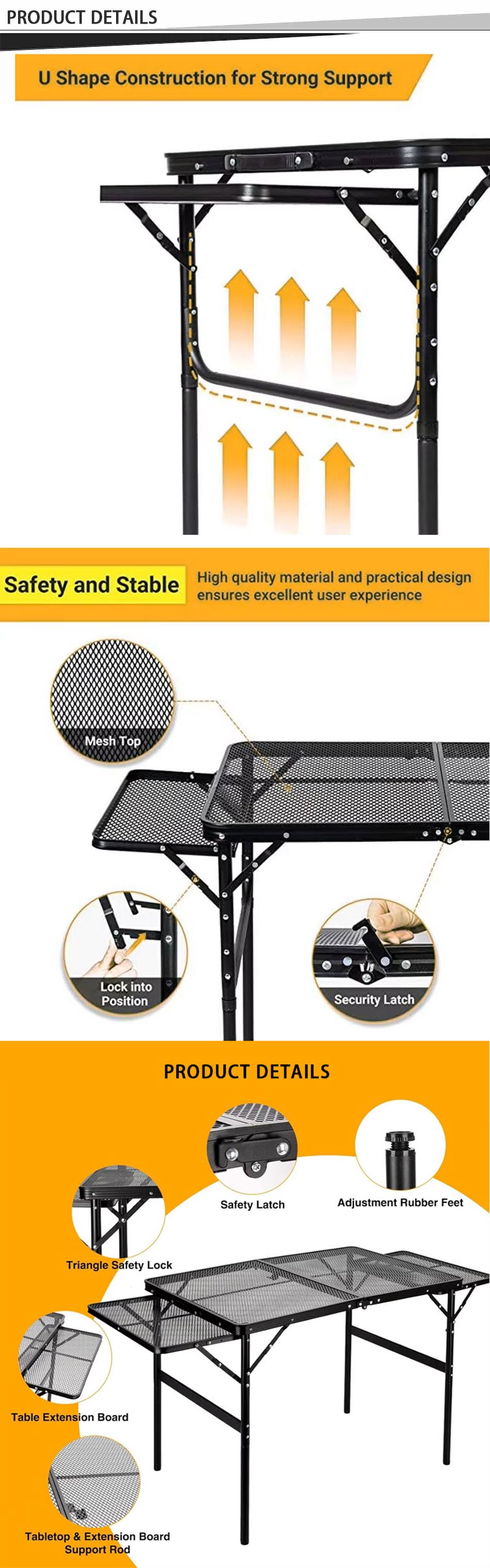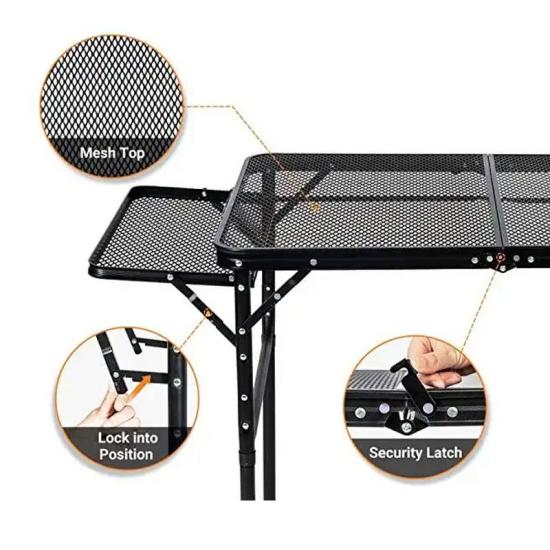 Picnic Outdoor Shelf Folding Metal Grill Table med 2 sideshyller er en allsidig og holdbar camping som er essensielt, designet for utendørs matlaging, grilling og familiesammenkomster.