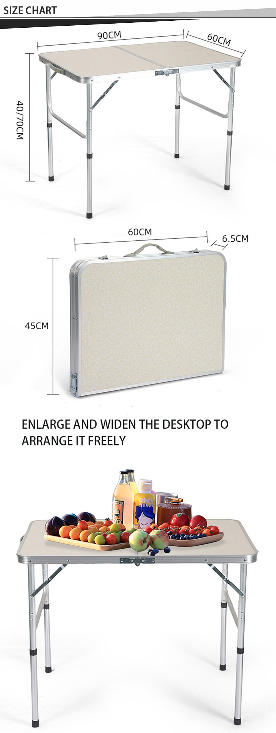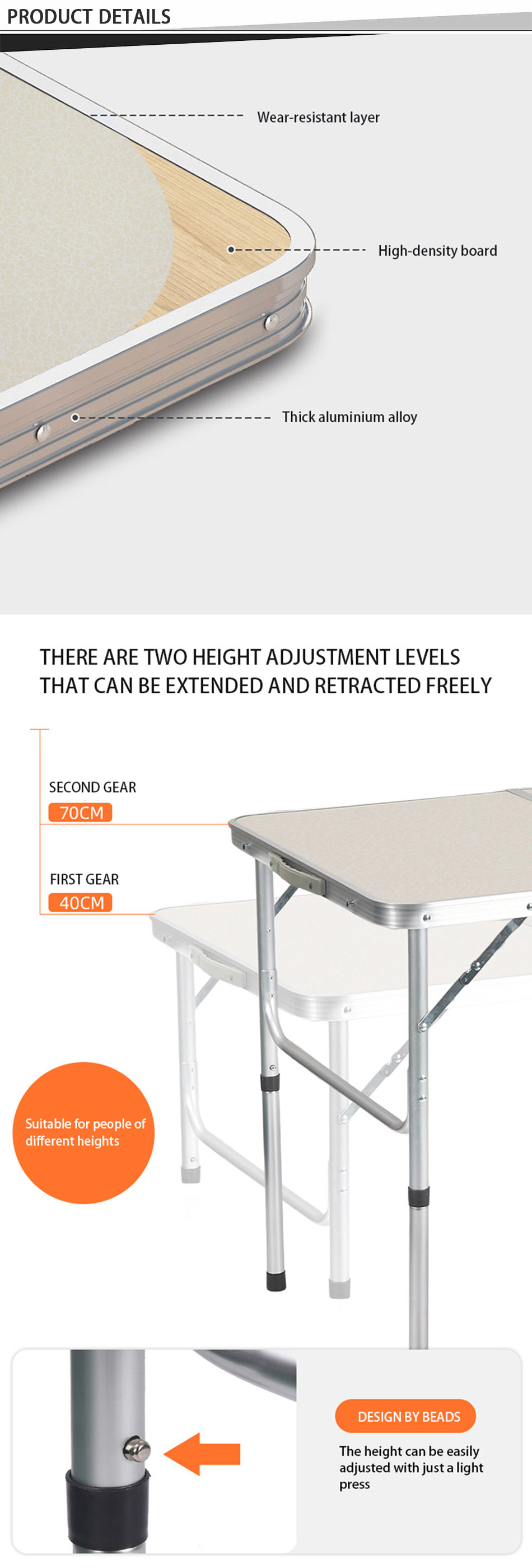 1. F olding campingbord design : Den sammenleggbare designen til bordet er praktisk å bære og spare plass. 2. Enkel å montere, ingen andre verktøy er nødvendig, og bordet kan monteres på bare noen få sekunder, noe som sparer tid og krefter. 3. Super slitesterk og stabil: laget av høykvalitets aluminiumslegering, solid og slitesterk, vanntett og lett å rengjøre. 4. Tilpasset service: Det er forskjellige størrelser og farger å velge mellom, og du kan også tilpasse logoen. 5. Multi-purpose: spesielt egnet for utendørsaktiviteter, brukt som camping utendørs bord, fotturer, piknik, grilling, piknikbord, fiske, strand og innendørs bruk.
