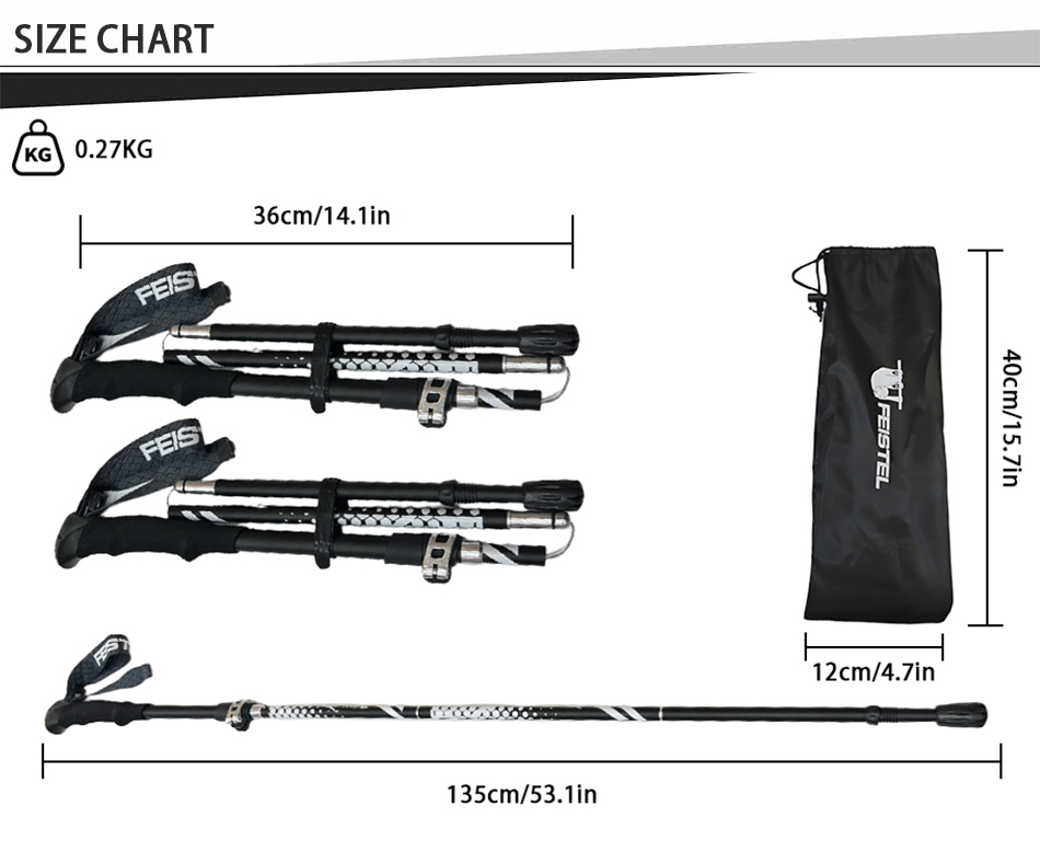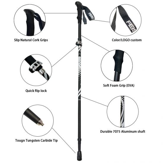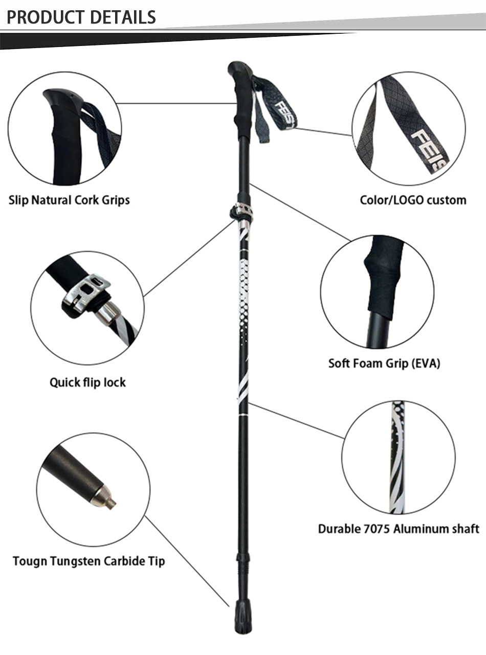 Merke : ANHUI FEISTEL-FABRIKKEN Relatert produksjon : OEM og ODM Produkt : De ultralette multifunksjonelle, sammenleggbare turstavene i aluminium 7075 har slitesterk konstruksjon, komforthåndtak i EVA og er kompakte og bærbare, og tilbyr pålitelig støtte for fotturer, klatring, fotturer og hverdagslige gåturer.