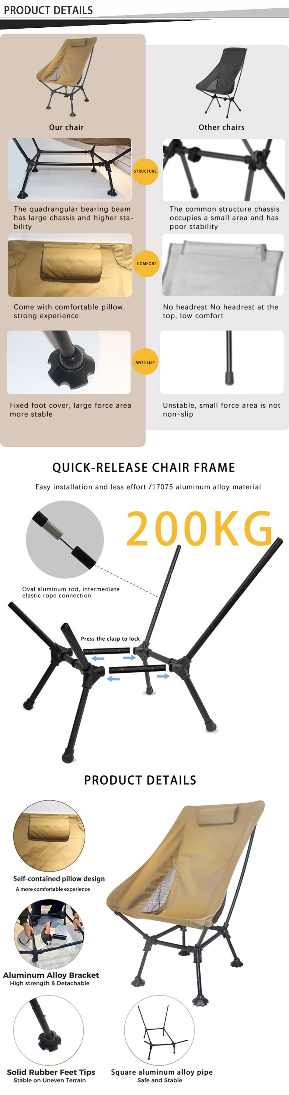 Merke : ANHUI FEISTEL FACTORY Relatert produksjon : OEM & ODM Produkt : Sammenleggbar aluminium utendørs strandcamping bærbar stol, komfortabel og bærbar, du kan nyte fritid og komfort mens du camper.